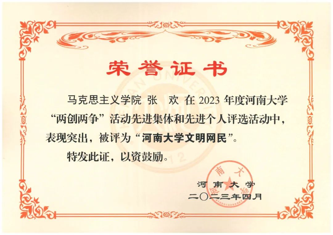 近日,根据《中共河南省委教育工作委员会河南省教育厅关于开展2023年度全省教育系统“两创两争”活动先进集体和先进个人推选工作的通知》(豫教工委〔2023〕36 号)精神,学校积极开展“两创两争”活动先进集体和先进个人评选工作,党委宣传部组织专家开展2023年度304am永利文明网民评审工作,共评选出文明网民5人。今天,就让我们来了解一下2023年度304am永利文明网民——张欢。